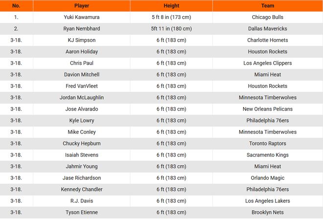 雷速体育10月12日讯 欧洲媒体BasketNews盘点了新赛季NBA球员的身高,其中重点关注了身高较矮的球员。尽管NBA历史上有很多身高不到6英尺的NBA球员,但目前在NBA中只有两名这样的球员,分别是公牛队的河村勇辉(5英尺8英寸,1米73)和独行侠的内姆布哈德(5英尺11英寸,1米80,步行者球员内姆布哈德的弟弟)。河村勇辉连续两个赛季成为NBA最矮球员,今年夏天他与公牛队签订了一份双向合同,并且在夏季联赛和季前赛中有不错表现。上赛季他在灰熊效力。此外,有16名球员的身高正好是6英尺,也就是1米83,其中包括了保罗、范弗里特、康利、洛瑞、阿尔瓦拉多等多位叱咤NBA的名将。