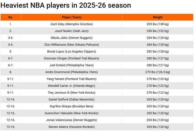 新赛季NBA所有球员具体体重排名如下:1、扎克-埃迪 灰熊 305磅(约138公斤)2、努尔基奇 爵士 290磅(约132公斤)3、约基奇 掘金 284磅(约129公斤)锡安 鹈鹕 284磅(约129公斤)5、大洛佩斯 快船 282磅(约128公斤)6、克林根 开拓者 280磅(约127公斤)恩比德 76人 280磅(约127公斤)8、德拉蒙德 76人 279磅(约126.6公斤)9、杨瀚森 开拓者 270磅(约122公斤)小温德尔-卡特 魔术 270磅(约122公斤)杰米森 尼克斯 270磅(约122公斤)12、加福德 独行侠 265磅(约120公斤)戴隆-夏普 篮网 265磅(约120公斤)亚布塞莱 尼克斯 265磅(约120公斤)瓦兰丘纳斯 掘金 265磅(约120公斤)史蒂文-亚当斯 火箭 265磅(约120公斤)