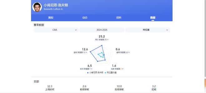 CBA24-25赛季常规赛,他场均可砍下25.2分12.6篮板6.5助攻1.6抢断,后三项数据均联盟前十水平。