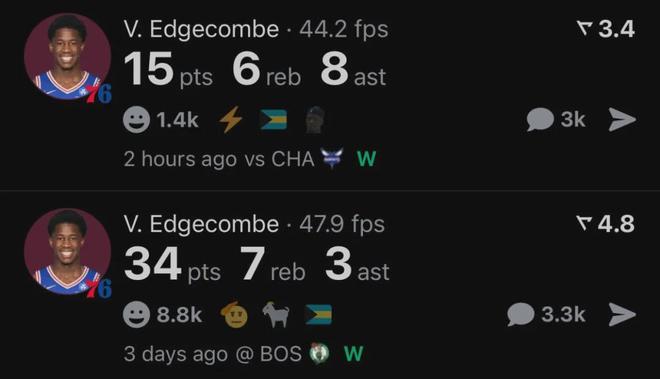 北京时间10月26日,NBA常规赛,76人125-121战胜黄蜂。恩比德有出场时间限制,本场只打了20分钟,投篮11中7,三分6中3,罚球5中3,得到20分2板4助2断4失误。马克西20投7中,三分9中4,罚球12中10,砍下28分6板9助。76人新科探花VJ-埃奇库姆首发出战39分半钟,15投6中,三分3中1,罚球2中2,得到15分6板8助3断1帽2失误,正负值+9全队第三。跟生涯首秀34+7+3相比,埃奇库姆的表现有所回落。但是再看看同届新秀,他已经足够出色。76人揭幕战117-116险胜凯尔特人。埃奇库姆投篮26中13,三分13中5,罚球6中3,狂轰34分7篮板3助攻1抢断。埃奇库姆的34分成为自1959年的威尔特-张伯伦(43分)之后,新秀球员在揭幕战的最高分,一场比赛轰动NBA!埃奇库姆出生于2005年7月30日,身高1米93,臂展2米02,体重88公斤。埃奇库姆来自巴哈马的比米尼岛,这座小岛的常住人口不足2500人,面积只有9平方英里(大约23.3平方公里),而且常年没电,晚上格外地难熬。2025年NBA选秀大会,埃奇库姆成为探花秀,他在接受采访时说:“回想起那些没有电的漫漫长夜,真的很艰难,我曾靠发电机生活了7年。”记者问他,从比米尼岛打进NBA的概率有多大?埃奇库姆回答:“0.00001%,可能还得多加几个零。”2019年,巴迪-希尔德在巴哈马举办训练营,大多数孩子都是16岁以上。当时埃奇库姆只有14岁,希尔德一开始拒绝了。后来希尔德想到了儿时的自己,最后同意埃奇库姆参加训练营,这个14岁的小伙打爆了很多比他年纪大的球员。正是这次训练营的经历,让埃奇库姆决定逐梦NBA,他在2020年前往美国。最后一问,你看好埃奇库姆拿最佳新秀吗?